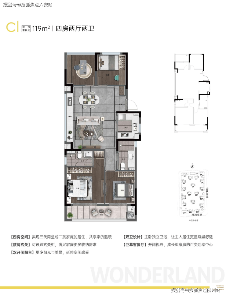 有没有考虑过给孩子的兴趣留一间房?给父母的念想留一间房?给自我的成长留一间房?一套宽敞奢阔的四居室最为合适。119方明星边套户型,完全满足大家庭的居住需求。