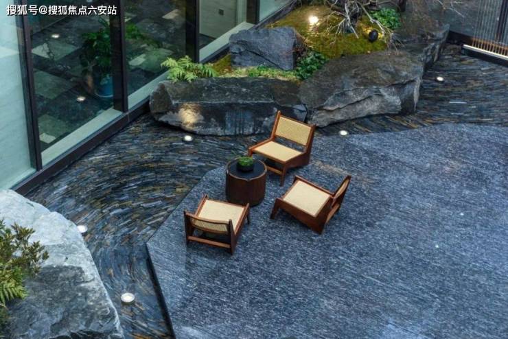 穿过景墙是下沉水院,连着售楼大厅和松林剧场,一边是水瀑潺潺,流淌成一幅古雅的宋韵山水画卷,一边是肆意舒展的罗汉松、老红梅、羽毛枫,铺展出悠远的东方意境。