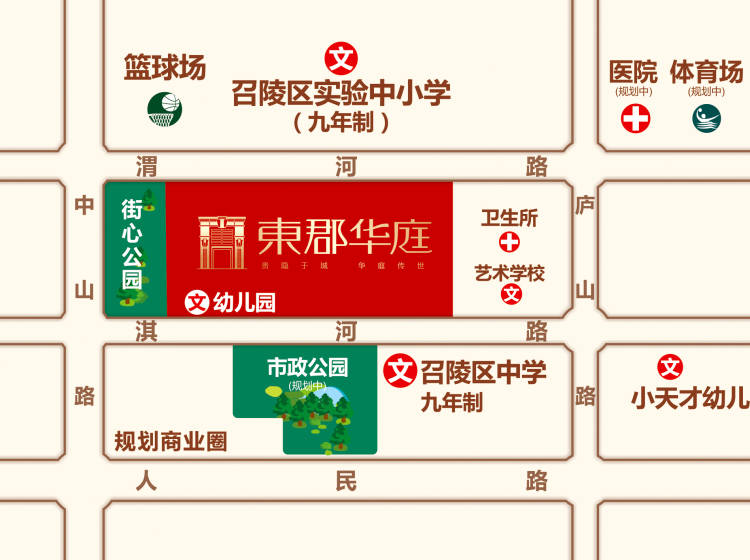 召陵区实验中学、筹建的召陵区中学!南侧规划中的市政公园;步行大概10多分钟,可以到项目南北两侧的市政公园!中国建设银行、中国工商银行、召陵区人民医院。