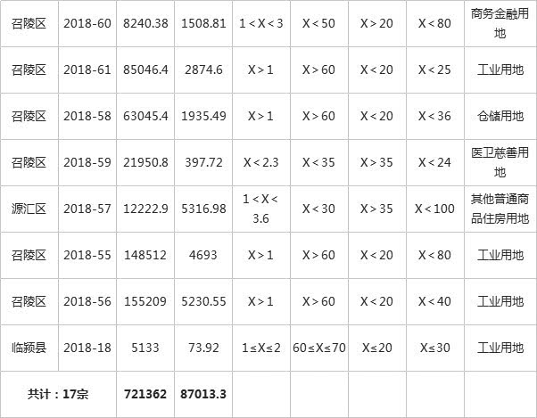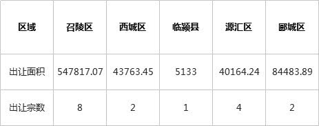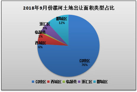 从中国土地市场网统计数据来看,2018年9月份漯河共挂牌出让土地17宗,总面积721361.65㎡。其中,郾城区土地挂牌出让2宗,出让面积84483.89㎡,占比12%;召陵区区地挂牌出让8宗,出让面积547817.07㎡,占76%;源汇区土地挂牌出让4宗,出让面积40164.24㎡,占比5%;西城区土地挂牌出让2宗,出让面积43763.45㎡,占比6%;临颍县土地挂牌出让1宗,出让面积5133㎡,占比1%。