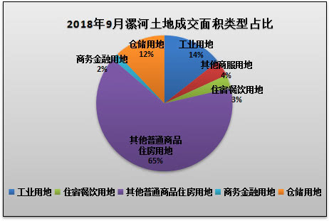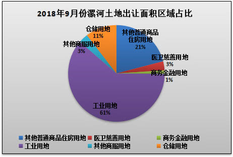 从土地出让类型来看,2018年9月份漯河共挂牌出让土地以其他普通商品住房用地、医卫慈善用地、商务金融用地、工业用地、其他商服用地、仓储用地为主;其他普通商品住房用地挂牌出让5宗,出让面积为151237.58㎡,占比21%;医卫慈善用地挂牌出让1宗,出让面积为21950.82㎡,占比3%;商务金融用地挂牌出让1宗,出让面积为8240.38㎡,占比1%;工业用地挂牌出让6宗,出让面积为441608.84㎡,占比61%;其他商服用地挂牌出让1宗,出让面积为22732.75㎡,占比3%;;仓储用地挂牌出让3宗,出让面积为75591.28㎡,占比11%。