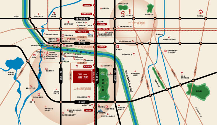 黄金中轴——一条大学路,锚定二七主城黄金地段,串联城市核芯资源配套。