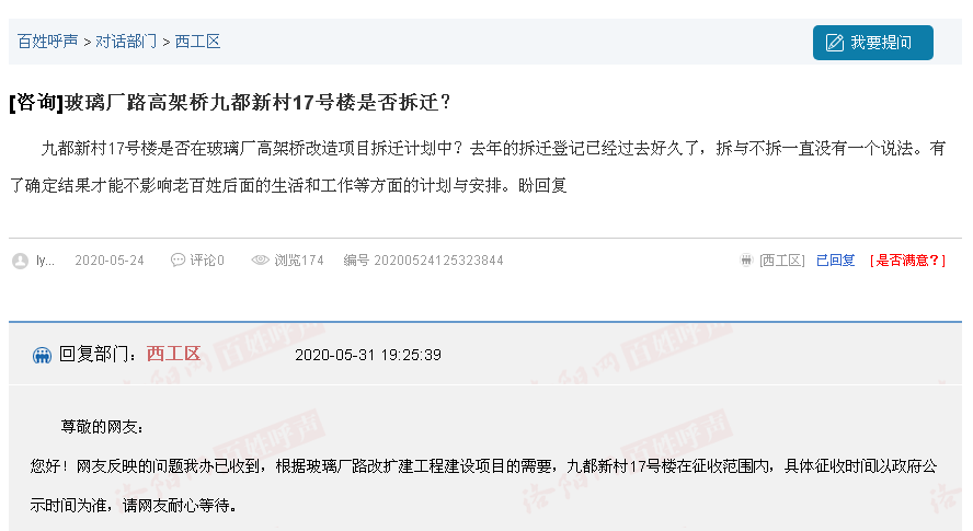 九都新村17号楼是否在玻璃厂高架桥改造项目拆迁计划中?去年的拆迁登记已经过去好久了,拆与不拆一直没有一个说法。有了确定结果才能不影响老百姓后面的生活和工作等方面的计划与安排。盼回复
