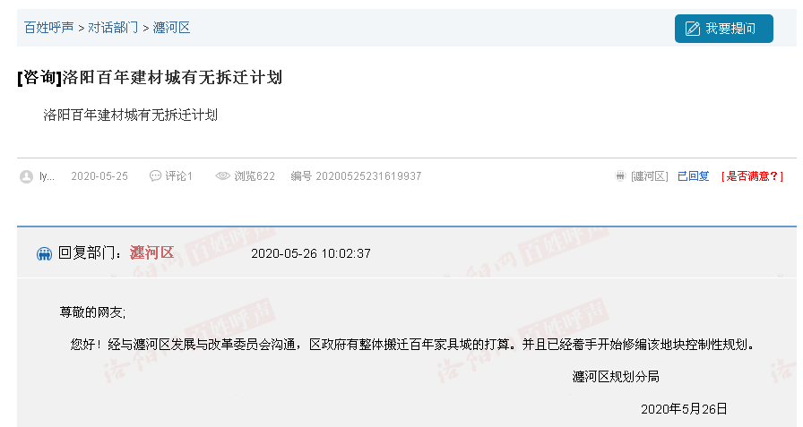 尊敬的网友;您好!经与瀍河区发展与改革委员会沟通,区政府有整体搬迁百年家具城的打算。并且已经着手开始修编该地块控制性规划。