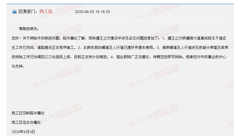 尊敬的网友:您好!关于网贴中反映的问题,经办事处了解,现将瀍王立交建设中涉及征迁问题回复如下:1、瀍王立交桥瀍涧大道直线段主干道征迁工作已完成,道路建设正在有序施工。2、北侧东西向辅道及人行道已建好并通车使用。3、南侧辅道及人行道涉及的部分房屋及库房的拆除工作已协调四三三处逐级上报,目前正在按计划推进。4、莲达钢球厂正在搬迁,待腾空后即可拆除。感谢您对市政事业的关心与支持。