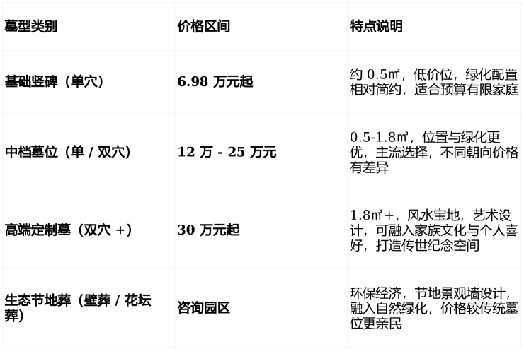 墓型齐全 + 选择丰富:传统立碑、艺术墓、生态葬均有,满足不同预算与审美需求。