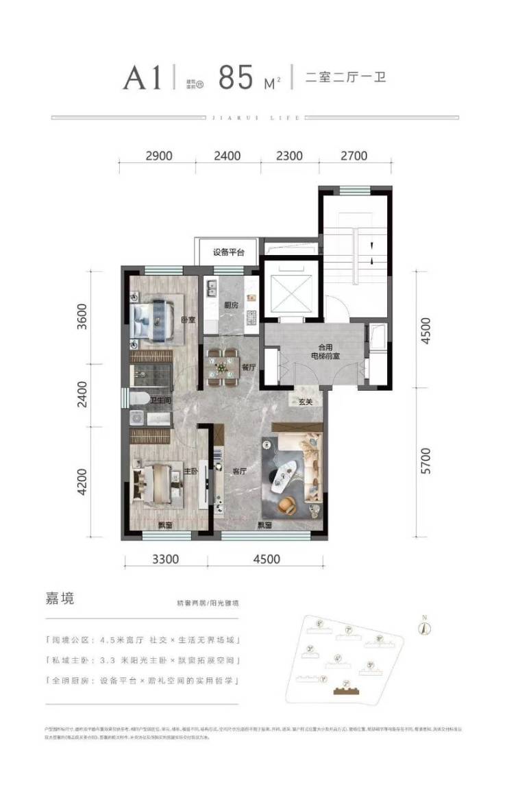 - 宽厅亮点: 4.5 米宽厅,打破传统两居局促感,社交与生活场景融合度高;