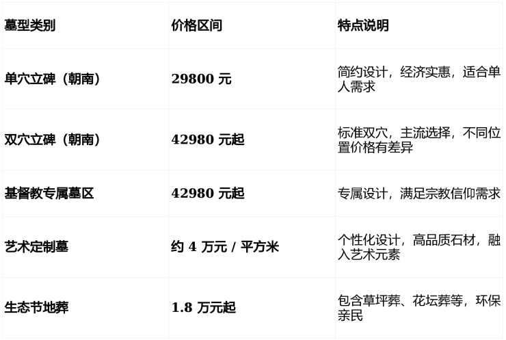 墓型齐全:传统立碑、生态葬、家族墓、艺术墓全覆盖,选择多样。