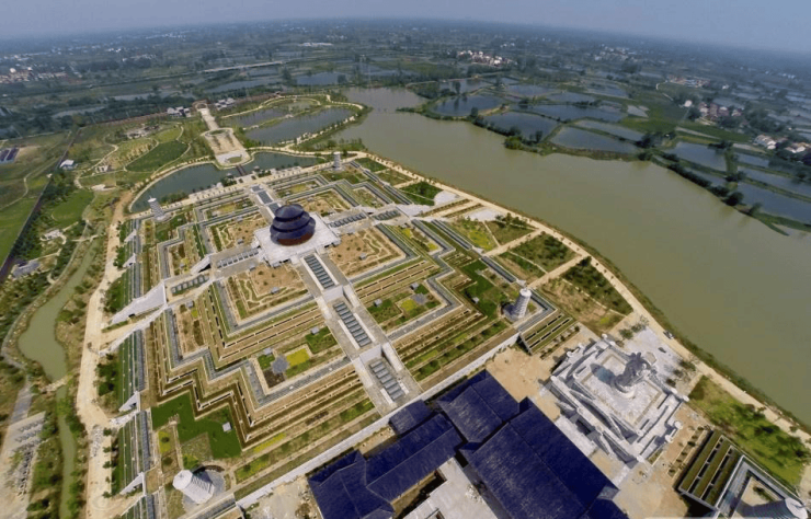 - 建筑特点:有南北两座地宫,内空高,分三层放置骨灰,顶部仿北京天坛用于观光造景,内部通道切割成“非字型”,中间有祭祀中心和19米高四面观音像 。