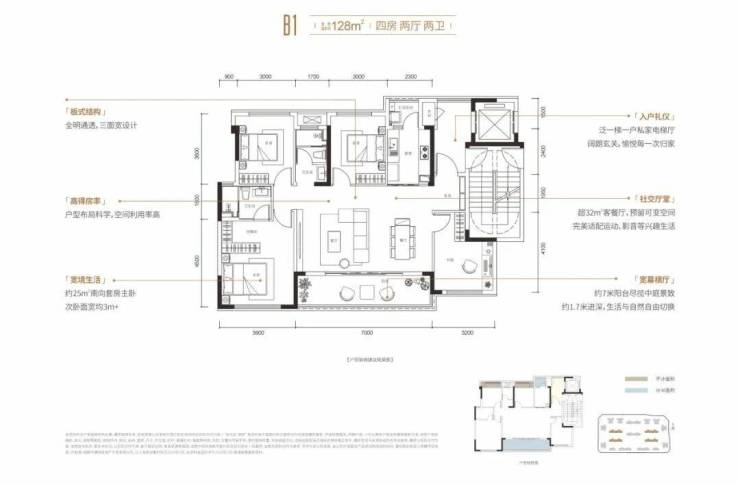 做到了1梯2户、约7㎡的私享入户厅,四室双卫还有约32㎡的大横厅,实得面积更是达到了约100%。要知道这样的配置,基本只存在于建面约143平以上的改善产品。