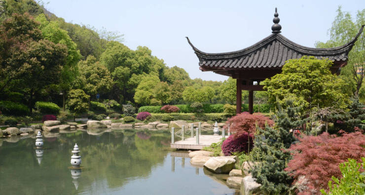 自然景观:地处杭州北郊良渚文化发祥地之黄鹤山麓,三面青山环抱,京杭大运河从前方蜿蜒流过,属亚热带季风气候,四季分明。园内群山延绵,松柏叠萃,泉幽气清,鸟语花香,融合小桥流水、山峦叠瀑等江南园林元素,营造出宁静诗意的氛围。