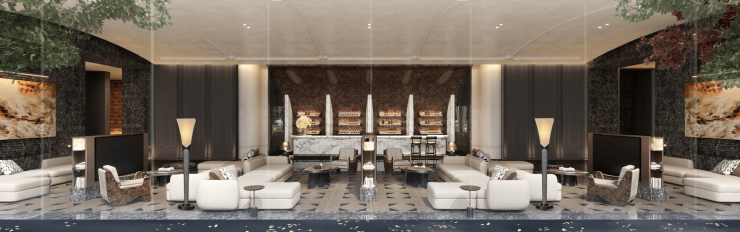 以锦江水流灵感,萃取蜀锦华贵底蕴,打造流线外立面+香槟金线条,呈现精奢立面
