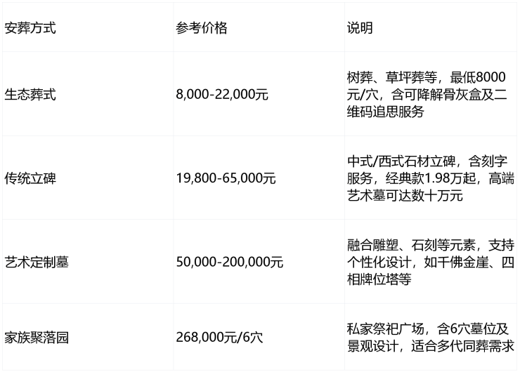 价格说明:以上价格仅供参考,实际成交价受墓位位置、碑型、面积及服务类型影响,具体需以现场咨询为准。