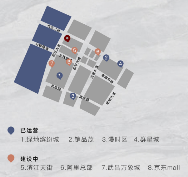 项目紧邻华润武昌万象城(预计2024年5月初开业)、阿里巴巴(预计2026年建成使用)、龙湖武昌滨江天街(建设中)、长江中心等超级商业体,商业全面升级,焕发新能量。