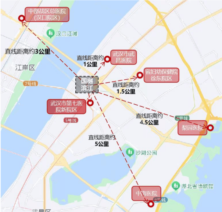 「三甲护航 呵护健康生活」项目5-10分钟车程内拥有包含中南医院、梨园医院、中部战区总医院、湖北省妇幼保健院、武昌医院等多个三甲医院,项目南边不远就是在建的七医院新院区,目前已经封顶,建成后业主看病就医也比较方便。