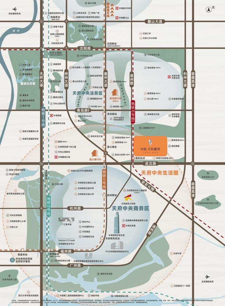 路网体系:"四横四纵"主干道环绕(沈阳路/青岛路/武汉路/麓山大道+天府大道/梓州大道/益州大道/蓉遵高速)