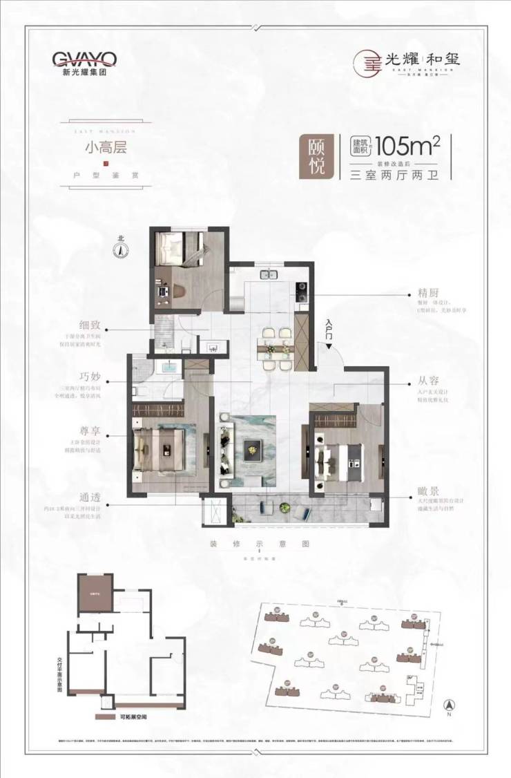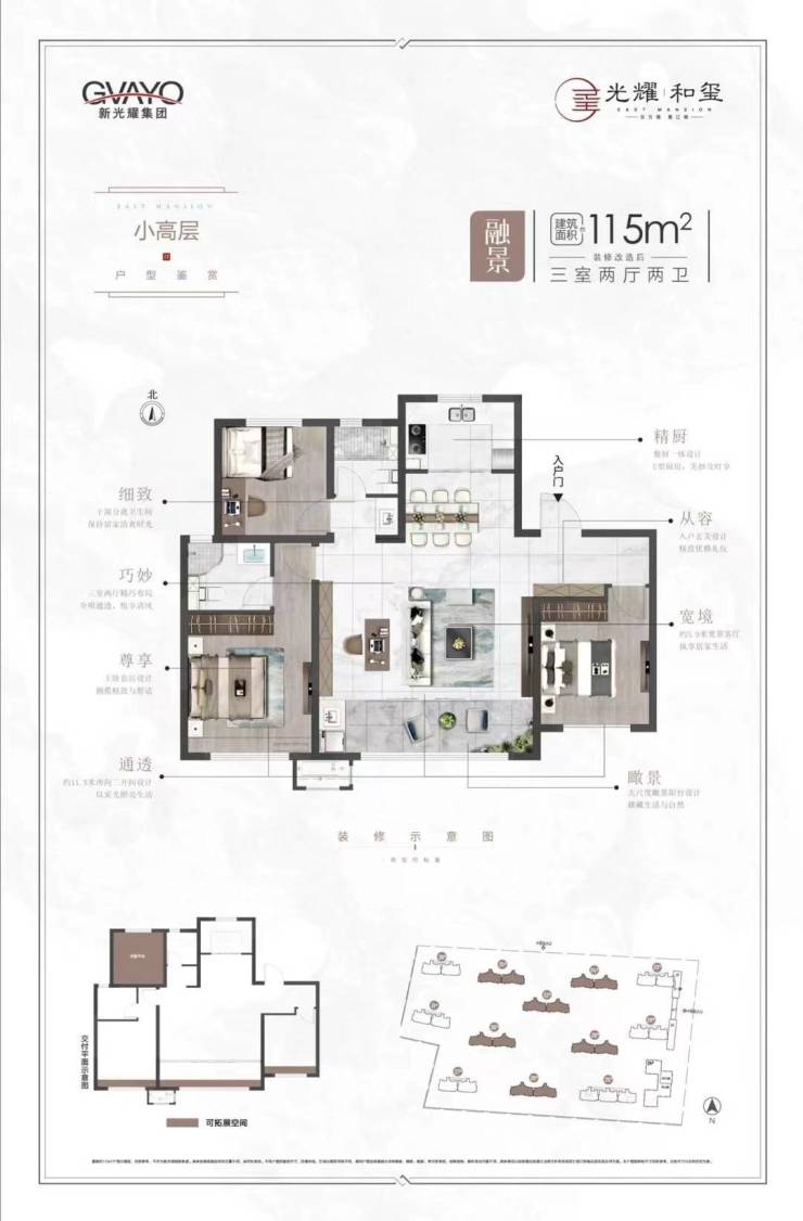 【小面积 高得房】光耀和玺·璟园精筑建面约 85-115㎡灵动美宅,可拓展空间大,得房率高达85%,秉承同等面积空间更大、房间更多的升级产品理念,不仅扩容了生活的多种可能,更提升居住舒适度。在这里,承载会客欢聚、亲子趣味、阅读陪伴等,充分满足家人向往的幸福生活。
