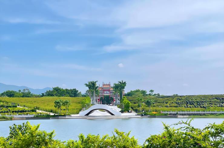 园区绿化覆盖率达50%,依山傍水,融合自然景观与人工造景,设有光孝廊、牌楼等文化景观,并配备24小时监控系统及专业安保、园艺团队,环境幽雅肃穆。