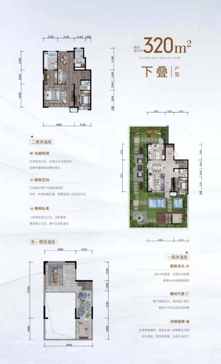 沙盘图:整个园区地势平坦,布局合理,地上规划7栋精装小高层,4栋清水叠拼别墅。小高层面积段140㎡/168㎡,叠拼别墅面积段178㎡/186㎡/320㎡。
