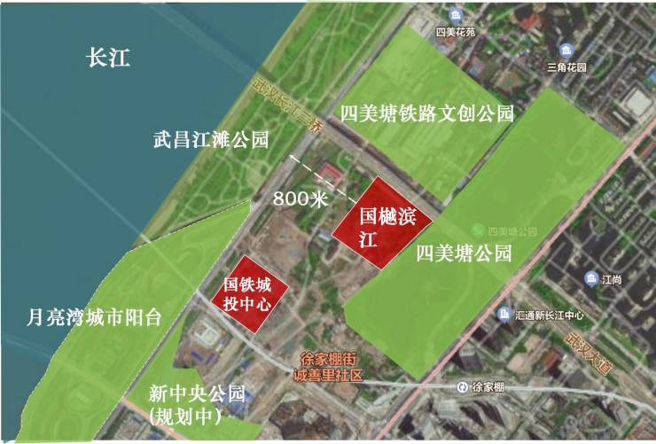 「一江一湖五园,武昌滨江生态绿核」项目位于长江畔,背靠四美塘,有月亮湾城市阳台、四美塘公园、四美塘铁路文创公园、武昌江滩公园、新中央公园(规划)等五园环绕,人文生态体系景色宜人,天然城市氧吧,生态宜居。