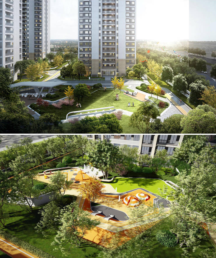 ②约4500㎡社区两大主题中心花园。社区架空层娱乐休闲空间。