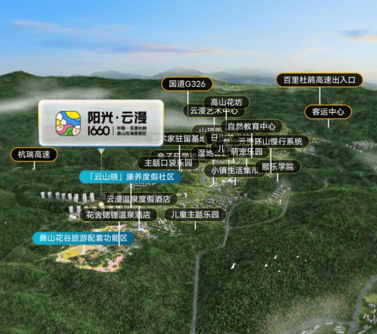 阳光云漫1660是由阳光大地集团和百里杜鹃合作打造的大型康养旅游度假区。项目占地约12000亩,其中约8000余亩为主题景区和公建配套设施,约4000余亩为旅游康养度假社区。