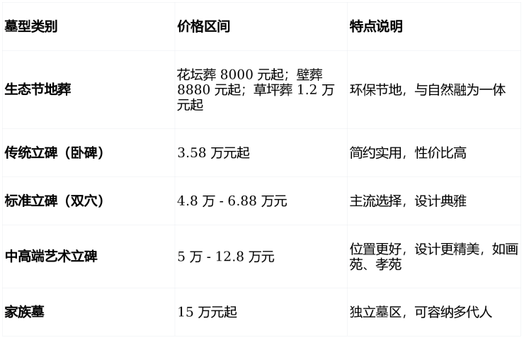 墓型多元:传统立碑、生态葬、家族墓齐全,价格透明