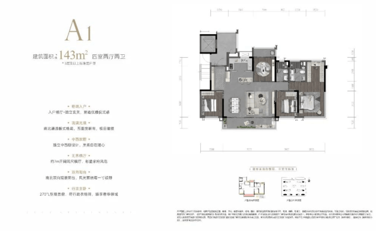 该户型端户客厅是完全悬挑的360°端厅设计,采光、视野超强;约3.2*4.6米超大尺寸的景观阳台。