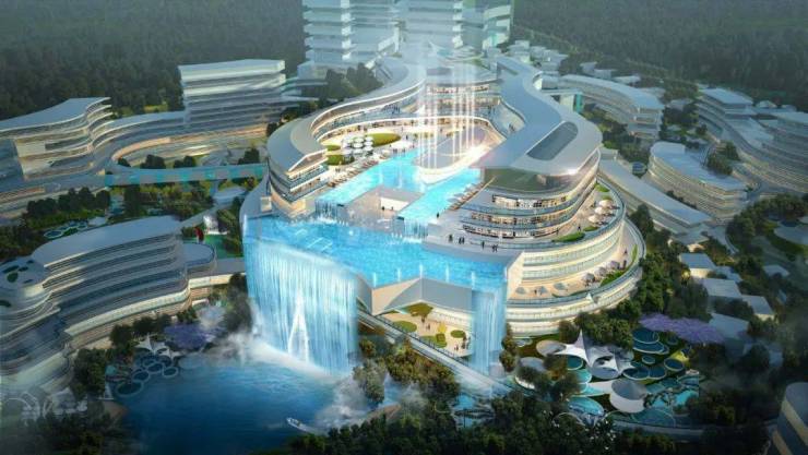 以佘山深坑酒店、新加坡樟宜机场为蓝本,结合勐巴拉山地溪谷地形特征,打造国内首个立体瀑布酒店。酒店依山而建,设计上遵循地势环境,利用自然高差,以地域风情披檐形式,将建筑融入自然,充分利用大黑山优美生态环境,汲取山川、雾霭、雨林等特有的自然资源,引水入园,融园于水的立体景观,打造首个最国际、最高端、最融合民族风情的立体瀑布酒店,创建深度体验感的旅游目的地。