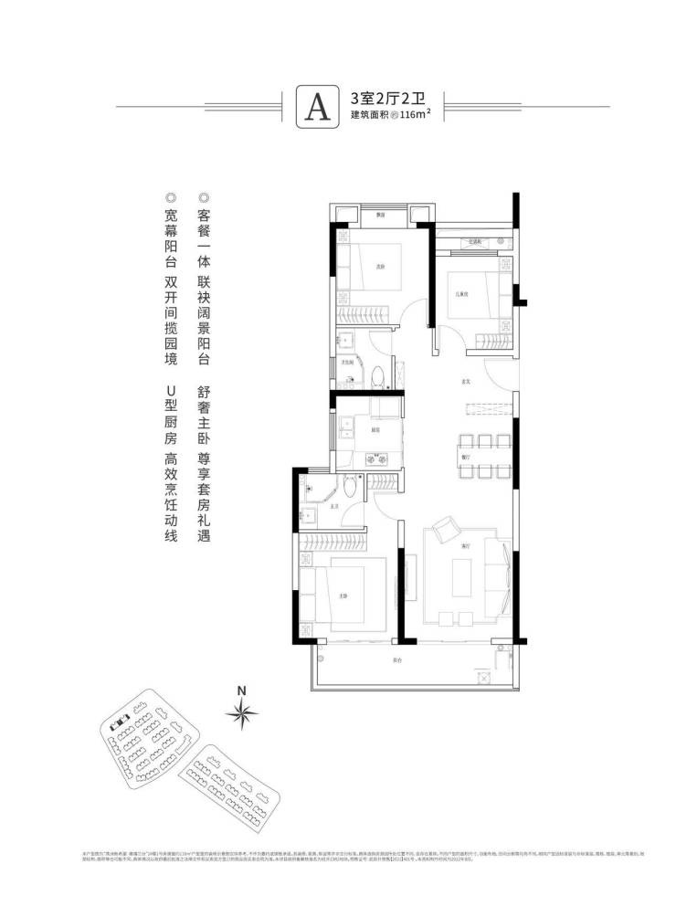 116㎡A户型(三房两厅两卫)位于#1楼边户