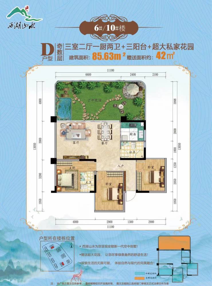 项 目 占地面积约50 亩 ,共由9 栋 18 层洋楼组成 ,均为第四代户型建筑,户型面积从 62 平精致两房到139 平豪华复式 ,也是安顺唯一房屋套内面积再做赠送的小区。西湖山水项目容积率 2.5,绿化率35%,小区配套儿童游乐场、健身休闲区6000 平中庭打造优质高端生活园林小区 ,带您尊享生活的诗篇 ,与自然同频的美好。由政府倾力打造的花山绿道蜿蜒西湖山水而过 ,作为安顺唯一铁路主题山体生态公园 ,小区道路直通绿道 ,花山绿道也将成为您茶余饭后的又一去处。三、在售户型鉴赏