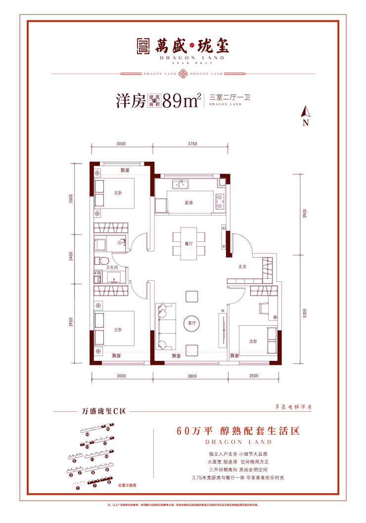 4、四大开间飘窗赠送约7.38平5、五星级居住体验,88%以上超高得房率,89平面积享105平居住感受