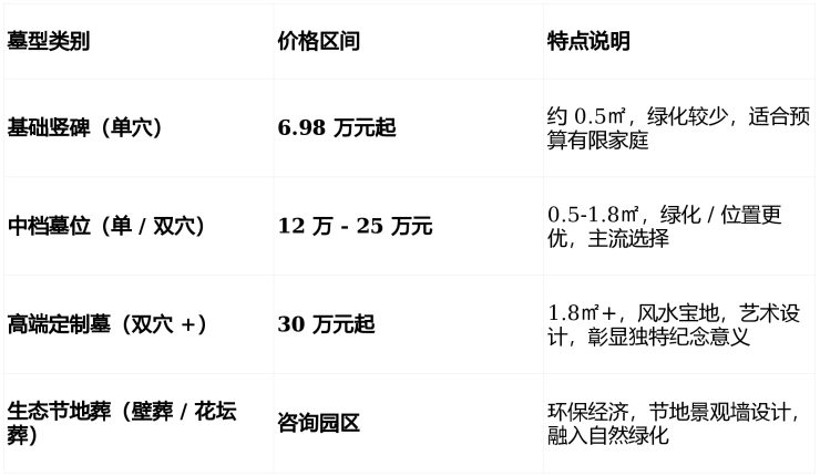 以上价格仅供参考,根据实际需求不同价格有所浮动,部分产品服务暂无,详情请拨打公墓电话咨询确认;