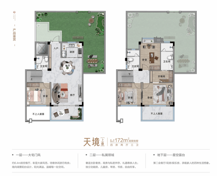 产品卖点:不同于洋房产品的局限性,院墅保证尺度舒适感的同事,提高空间利用率。上下叠产品均有各自亮点,从空间实用性到居住舒适感,真正实现终极人居。