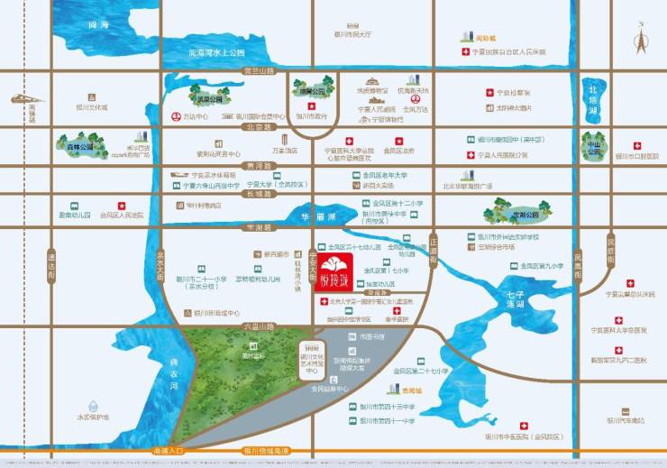 银川文化园、雁湖湿地公园、宝湖公园、典农河滨水景观公园