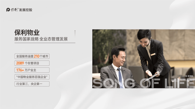 保利物业是保利发展控股旗下子公司,致力于全业态管理发展,定位为“大物业时代的国家力量”,以服务国家的战略,为客户提供更高品质的“柔性保障”。现服务于多家国资部委机关单位和大型央国企总部,包括国家司法部、国家信访局、国家开发银行、国家机关事务管理局住宅中心、中国机械进出口集团、上海联合产权交易所等。