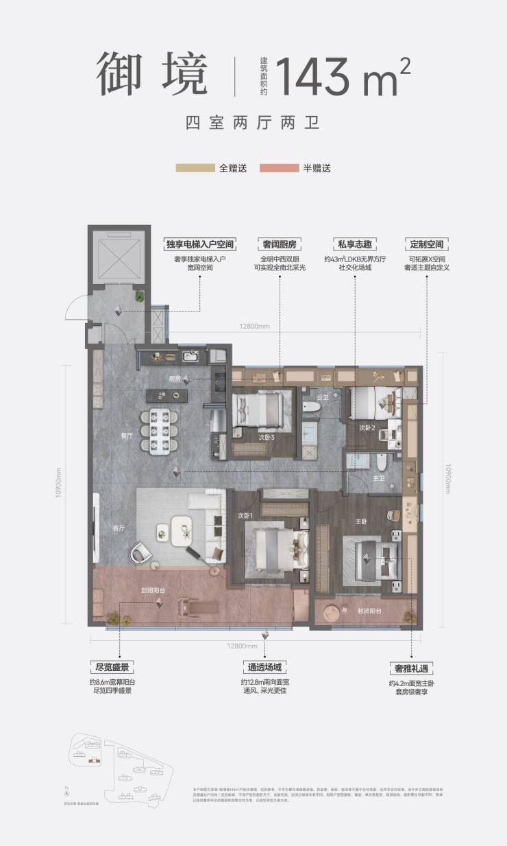 143㎡御境约93%得房率,8.6米大阳台,全能改善四房