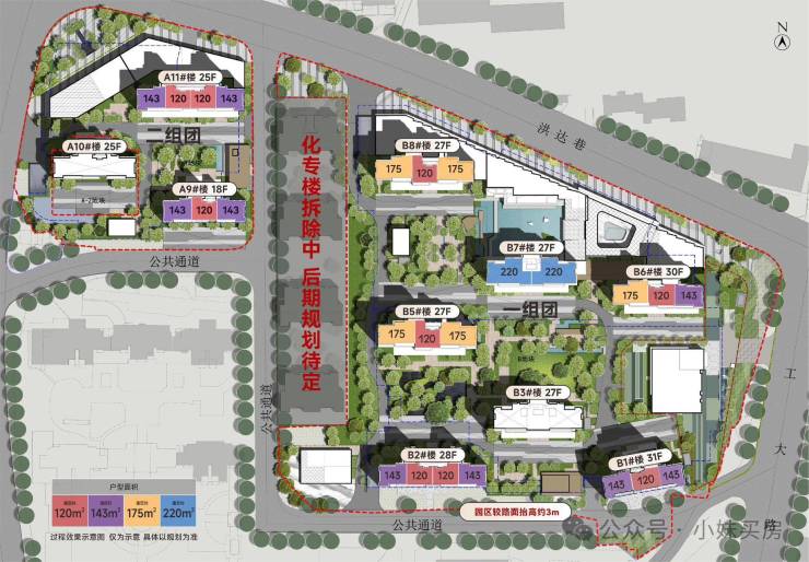 11号楼已加推,可看小区园林景观,1楼架空层,层高25,2梯4户,120平和141平,得房率92-93%,2.8万~3万