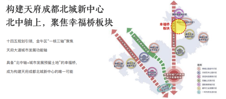 在国家成渝双城经济圈战略背景下,金牛区作为"科创文创新高地、宜居宜业新高地",正全力打造公园城市示范区。幸福桥板块凭借"北中轴+城市发展预留用地"的独特优势,成为构建北城新中心的核心载体。