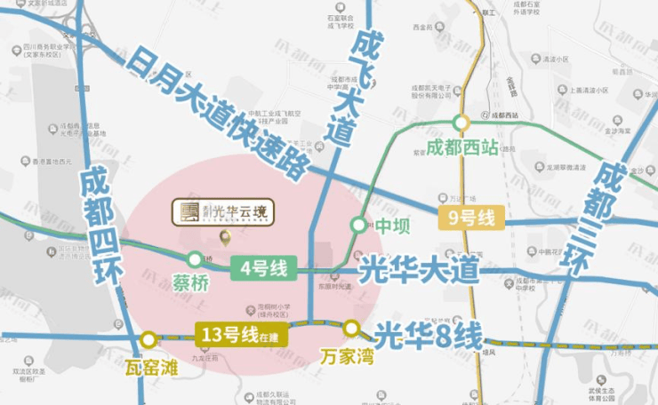 交通:三横三纵:日月大道、光华大道、光华8线,三环路、成飞大道、绕城高速。密织交通网络,极速通达全城。两地铁:地铁4号线、13号线(在建中),便捷交通动脉,一城繁华即刻畅达。