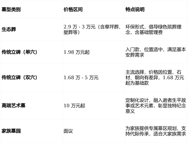以上价格仅供参考,根据实际需求不同价格有所浮动,部分产品服务暂无,详情请拨打公墓电话咨询确认;