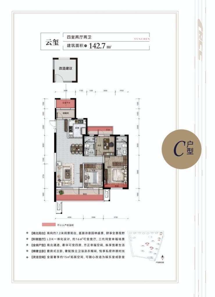 总住户:432户楼栋规划:4栋面积区间:建面约115/121/128/129/142㎡