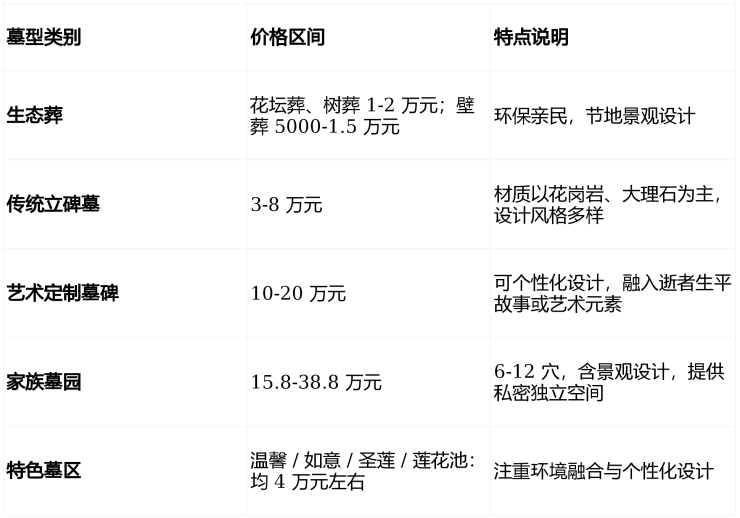 墓型齐全:传统立碑、生态葬、家族墓均有,选择多样。