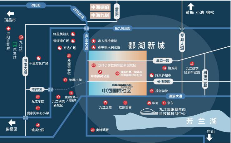 坐落庐山大道与濂溪大道交汇处,涵盖洋房、高层、商业等全业态产品,紧邻约4800亩芳兰湖湿地公园,以全球标准,国际体系,筑百万大城。