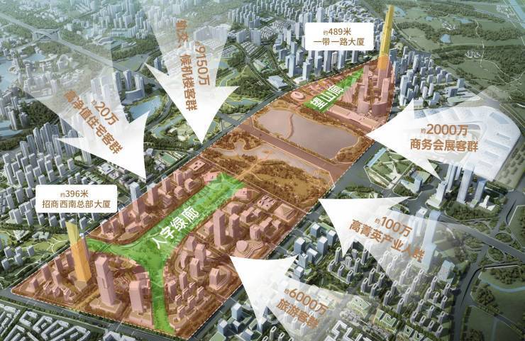 双地标之城——拥有396米高的489米一带一路大厦及招商西南总部大厦,形成西部最高的双地标,通过“人字绿廊+望山廊”连接;每年吸引来自国内外的千万旅游者。