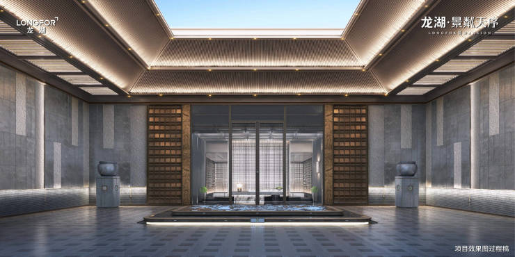 两侧设有天狮迎门,平安镇宅,彰显尊贵,步入院落,匠心设计聚福聚财的中式传统造园泗水归堂格局,尽显高贵入户礼序。