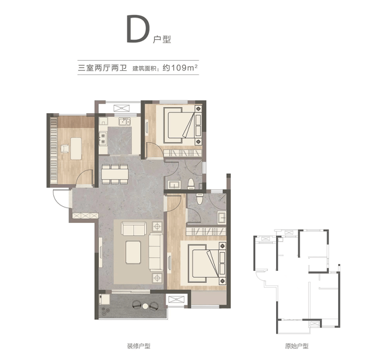 D户型:建面约109㎡(三室两厅两卫)