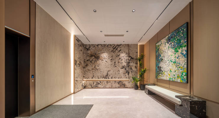 项目由北京顺景园林(北京悉昙酒店景观设计方)与HWCD(上海汤臣一品室内设计团队)操刀,以宋代《长河八景图》为蓝本打造240米中央水轴与"长河八景"园林。外立面采用石材与铝板结合,形成现代简约风格