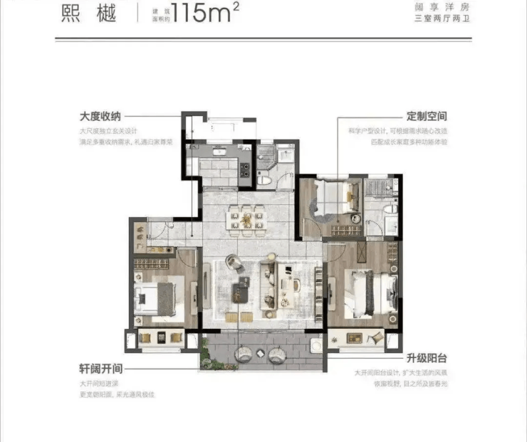 主力户型:89–103㎡三房(高层)、115–128㎡四房(洋房),得房率高达82.5%–85%,远超行业平均