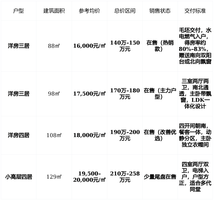 💰 在售情况:主力88–129㎡三至四居,均价1.6万–2万/㎡,总价140万起,现房清盘中